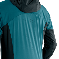 Zároveň prepúšťa vlhkosť a prebytočné telesné teplo a tým zabraňuje prehriatiu pri náročných aktivitách. Na zadnej strane bundy ponúka perforácia extra priedušnosť, takže sa pod batohom toľko nepotíte. Bunda s kapucňou má atletický strih a zamerala sa na skrátený dizajn. Na prednej strane sú dve vrecká na zips na uloženie drobností.