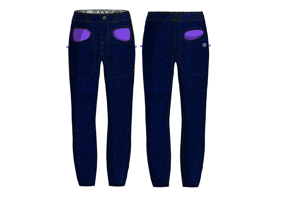 Moderné dámske lezecké nohavice úzkeho strihu a džínsového vzhľadu so štýlovými vreckami s okrúhlym vstupom. Vyrobené 100% v Taliansku s ohľadom na ochranu životného prostredia.