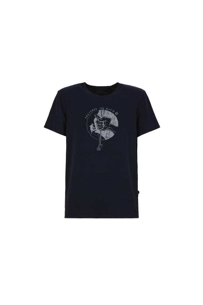 Moderné pánske tričko s krátkym rukávom 70S T-SHIRT je vyrobené zo 48% organickej bavlny, 48% bambusových vlákien a 4% elastanu. Tričko má na hrudi štýlovú potlač s lezeckou tematikou. Je vyrobené 100% v Taliansku s minimálnym znečistením životného prostredia as dôrazom na extravagantné prevedenie, unikátny dizajn a komfort pri lezení.